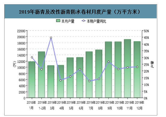 圖8:2019年瀝青及改性瀝青防水卷材月度產(chǎn)量(萬平方米)